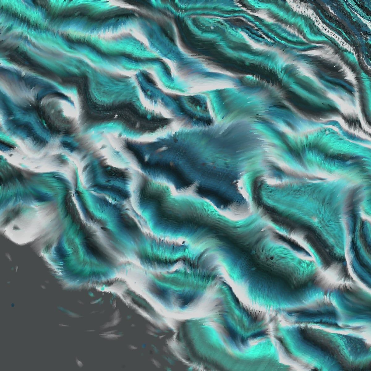 Entirely crafted through code, the waves in "Eternal Tides" transcend mere replication of oceanic movements; they are imbued with vibrant, evolving colors and patterns that echo the dynamic interplay of light upon the waters. Time plays a critical role in shaping the visual narrative, with a shader gradually altering hues to create a time-lapse effect reminiscent of polar stratospheric clouds and light dispersion in water. Each piece invites viewers to pause and observe the process that creates the artwork, where light, water, and form converge to narrate the ebb and flow of life’s experiences.